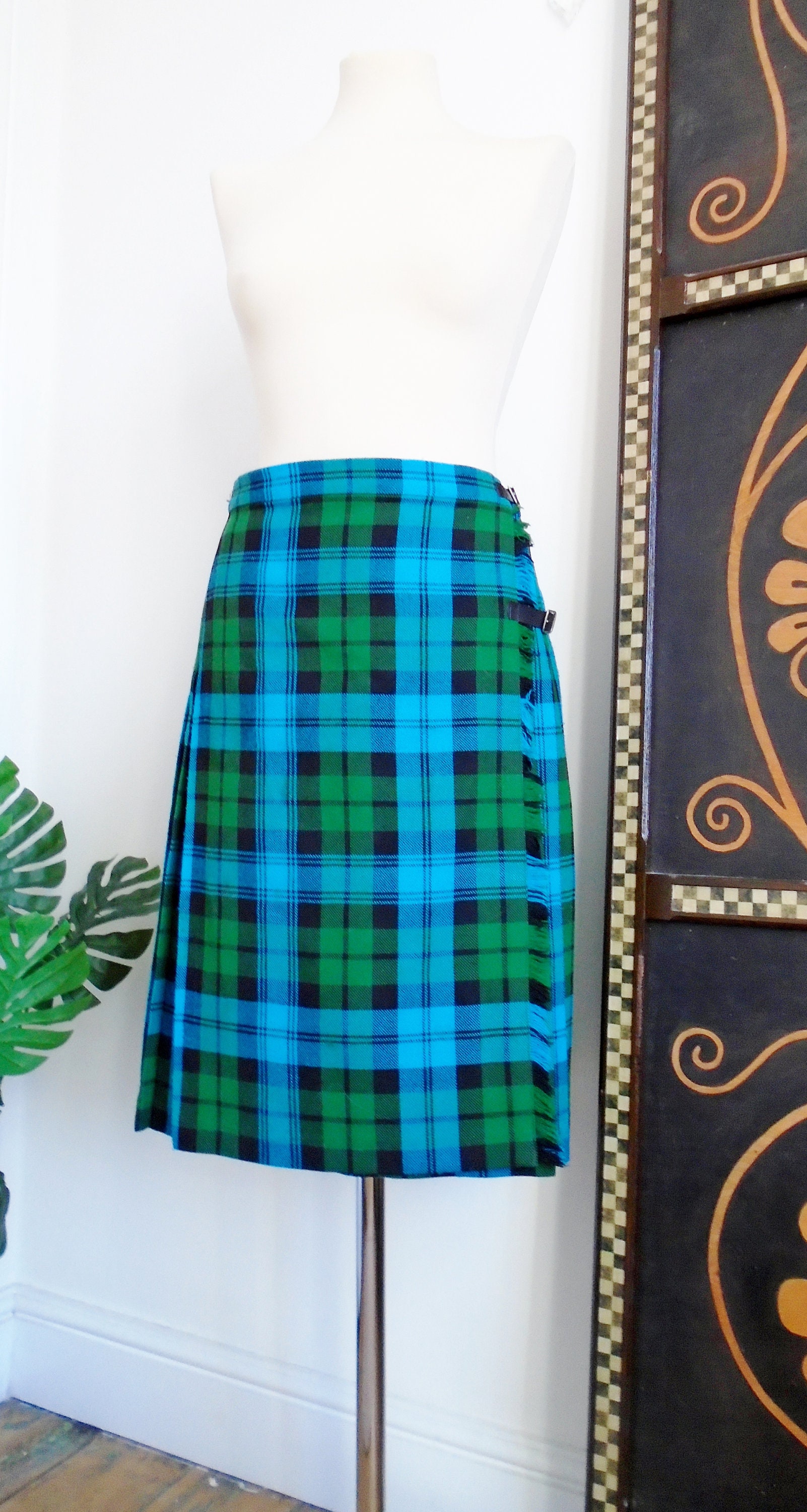 Vintage Tartan Kilt Skirt Blue Green Black Check Plaid Made In Etsy